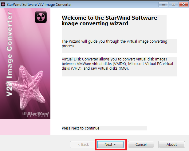 StarwindConverter를 설치하고 실행 후 Next를 누릅니다.