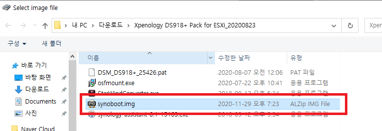 synoboot.img를 선택하고 열기를 클릭합니다.