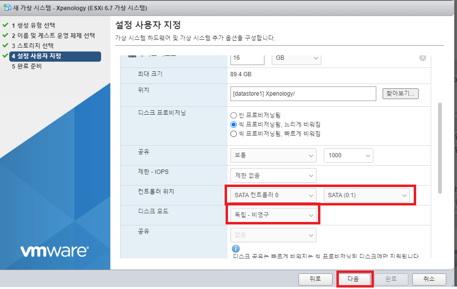 VM의 이름을 설정하고 아래와 같이 설정한 후 다음을 누른다.