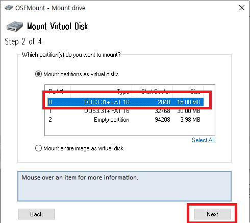 0번 "DOS3.31+FAT 16 15MB" 파트를 선택하고 Next를 누릅니다.