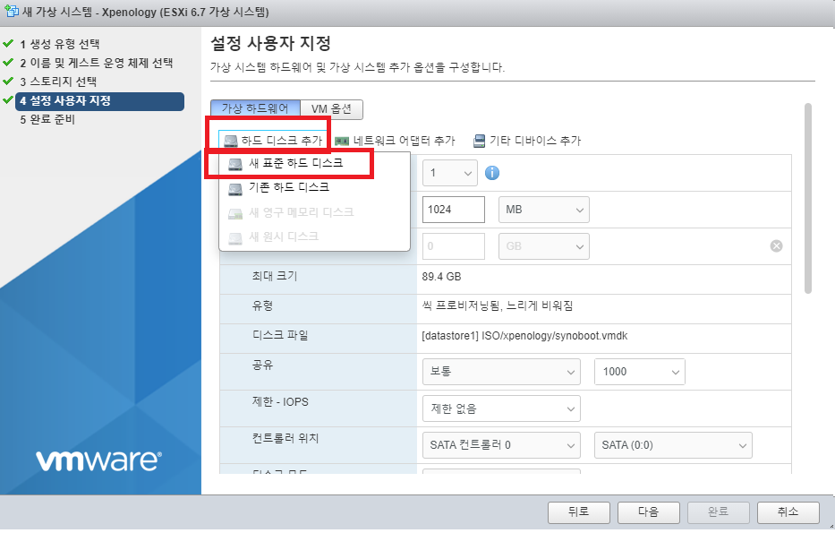 추가가 완료되면 다시 한번 하드디스크 추가 - 새 표준 하드 디스크를 선택한다.