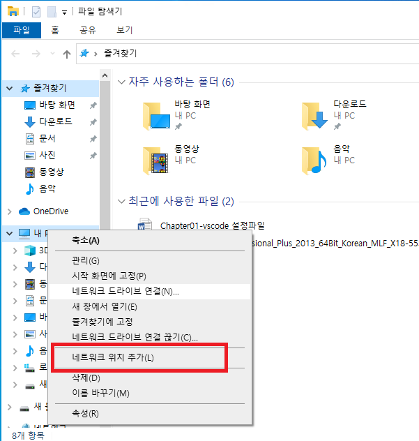 재부팅이 끝나면 파일 탐색기를 열고 내 PC에서 우클릭 후 네트워크 우치 추가를 누릅니다.