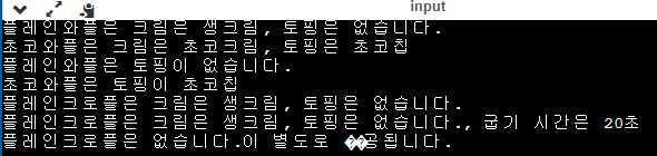 print(f'{menu}은 크림은 {cream}, 토핑은 {toping}, 굽기 시간은 {baketime}')