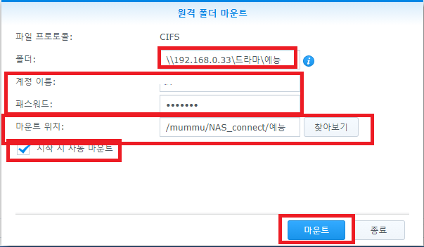 폴더 생성 후 도구 - 원격 폴더 마운트 - CIFS 공유 폴더를 누릅니다.