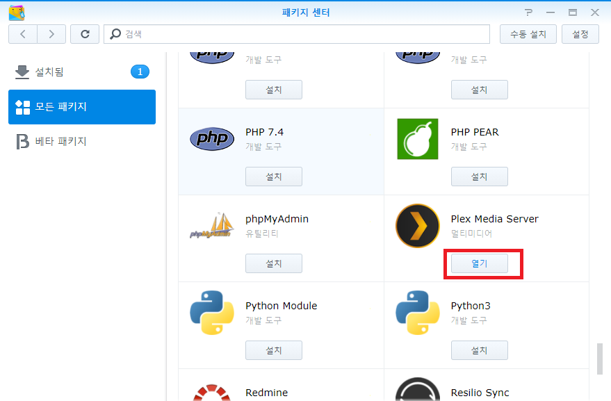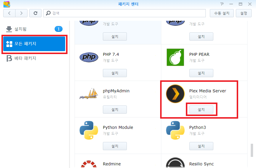 모든 패키지를 누르고 Plex Media Server를 찾은 후 설치를 눌러줍니다.