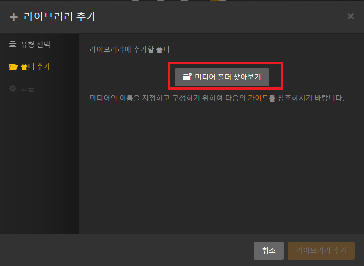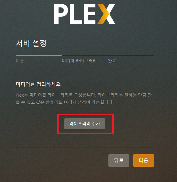 유형을 영화로 선택하고, 라이브러리 이름을 입력후, 미디어의 언어를 선택하고 다음을 누릅니다.