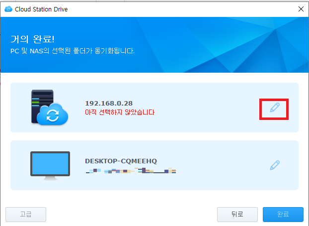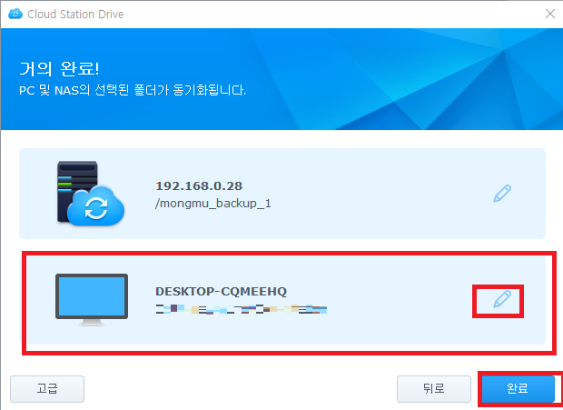 필요에 따라서 PC의 동기화 경로를 수정한 후 완료를 누릅니다.