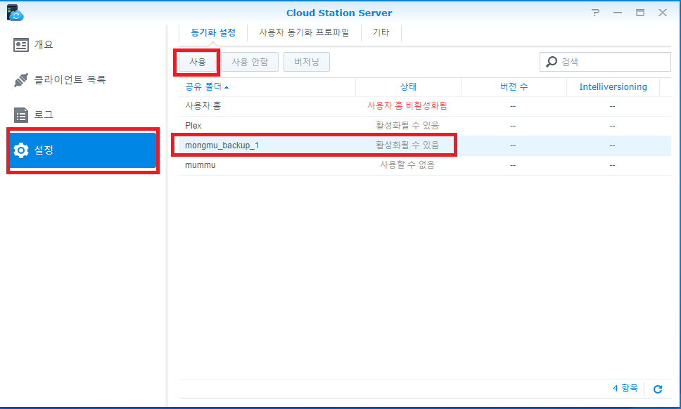 설정을 누르고 백업용으로 만들어둔 공유폴더를 선택 후 사용을 누릅니다.