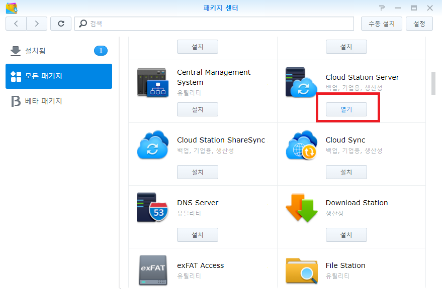 모든 패키지를 누르고 Cloud Station Server를 찾은 후 설치를 눌러줍니다.