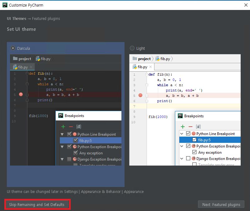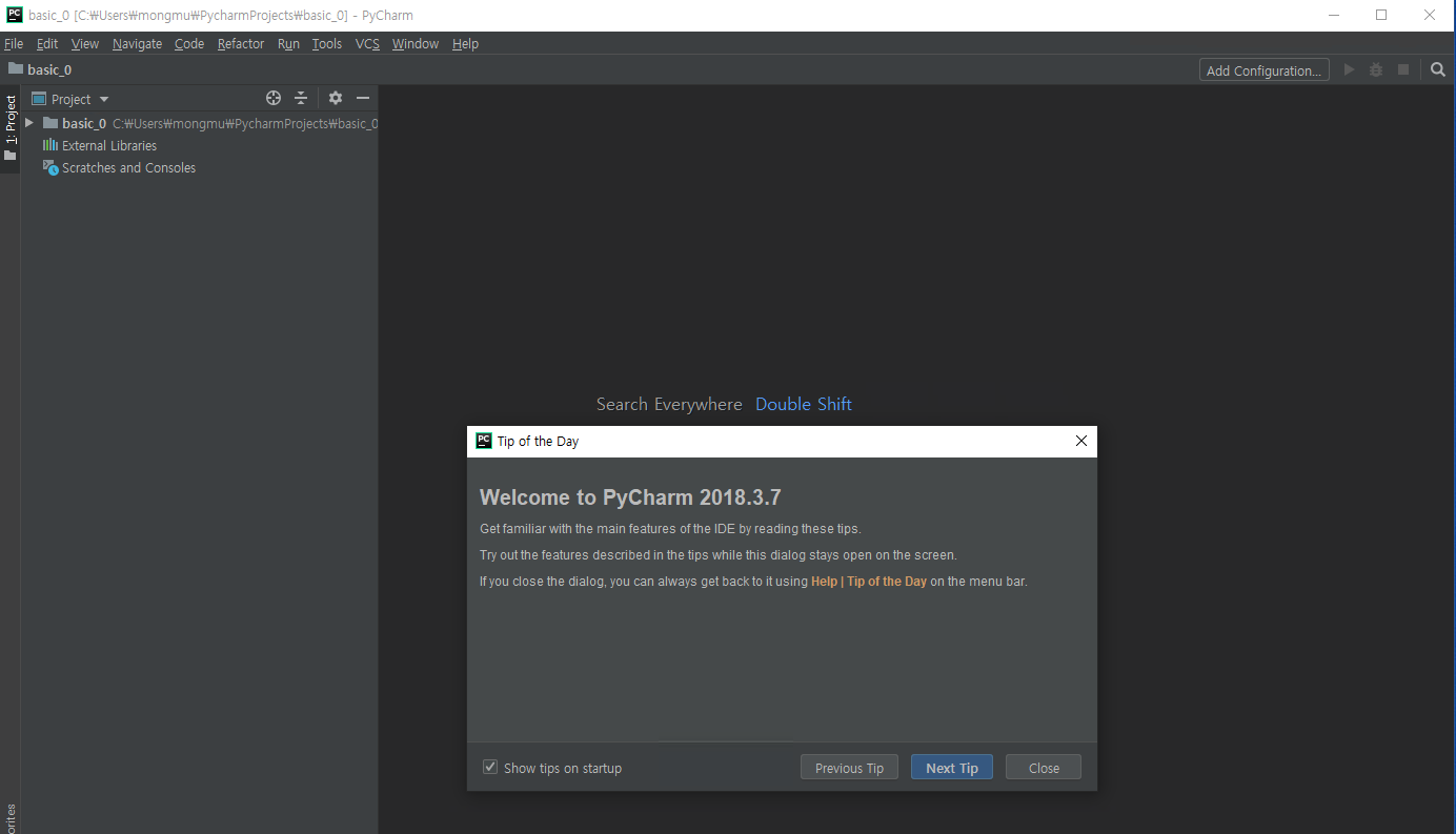 Pytham 설정 도움말이 나오는데요 Skip을 눌러서 넘겨줍니다.