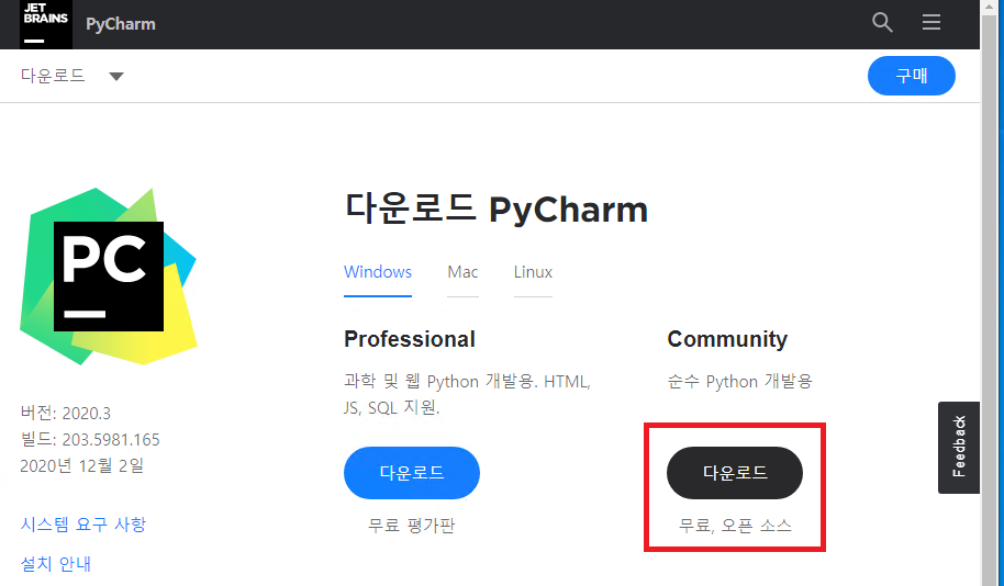 다음의 경로에서 Pycharm을 다운로드합니다.
