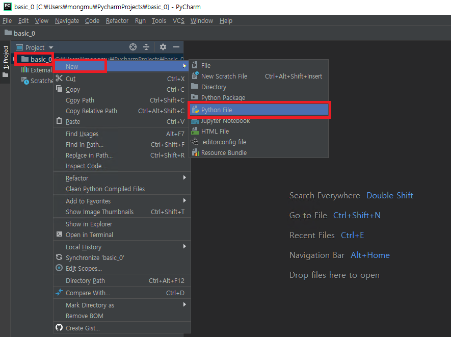 프로젝트 폴더에 우클릭 후 New - Python FIle을 누릅니다.