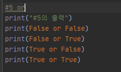or의 사용법은 코드처럼 (논리 연산 또는 불린) or (논리 연산 또는 불린)의 형식으로 사용합니다.