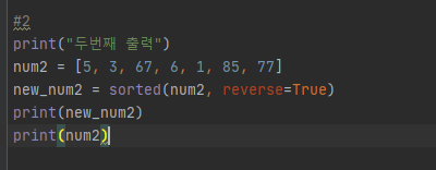 리스트 new_num2에 리스트 num2의 요소를 내림차순 후 정렬되어 저장된 것을 알 수 있습니다.