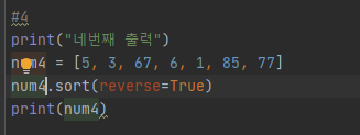 위와 마찬가지로 정렬되지 않은 7개의 요소를 가진 리스트 num4를 sort를 통해서 정렬하는 코드입니다.