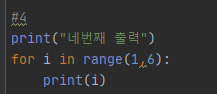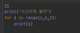 이렇게 range문에 2개의 파라미터가 들어간 경우, 범위는 1부터 6의 바로 앞인 5까지 입니다.