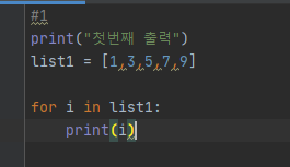 for문을 보면 대입 변수로 i를 사용하였고 대입 리스트 list1의 값을 i에 대입합니다.