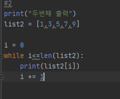 그리고 수행문은 list2의 i번째 값이 출력되도록 하고 i값을 1 증가시키는 코드입니다.